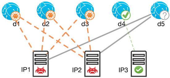 Resolution Relation [15]. The resolution relation means that domains with the same resolutions (hosted on the same IP) tend to have the same labels. This relation is strongly based on the rarity and expensiveness of malicious servers (IPs) where attackers can host domains. In fact, attackers widely reuse resources (especially malicious IPs) in malicious activities, such as domain-flux and fast-flux. As shown in Figure 2, domain d5 is considered to be malicious, because it is hosted on suspicious servers IP1, IP2, which host three known malicious domains d1, d2, d3 and no benign domains.