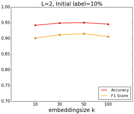 We first set the initial label fraction to 10%, , and experimented with k from 10 to 200. The results are shown in Figure 5. It can be seen from the figure that the embedding size k has little effect on the result: the accuracy and F1 score are almost unchanged as k increases from 10 to 200.