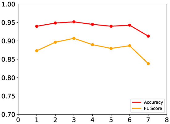 Then we set , initial label fraction to 10%, and experimented with L from 1 to 7. The results are shown in Figure 6. Different from embedding size k, it can be seen that L has more impact on the result: with the increase of L, the performance slightly increases at first, but as it continually increases, the performance decreases rapidly.