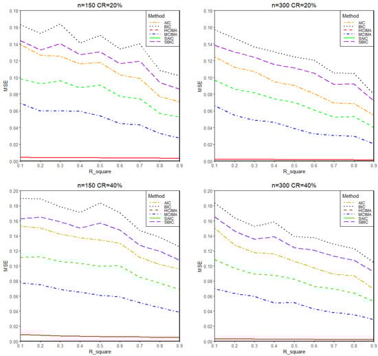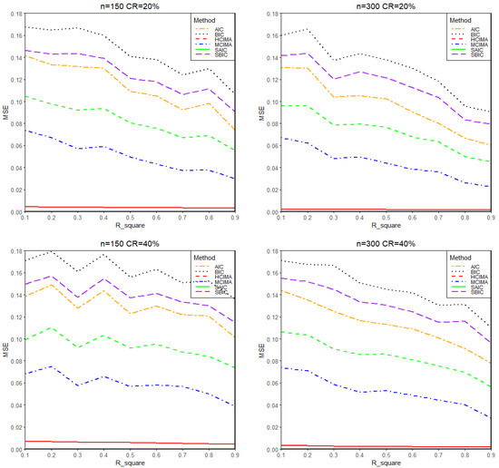 Comparing Figure 1 and Figure 2, it is observed that the MSE at MR = 20% is slightly higher than at MR = 40%. The reason for this occurrence is that when , the signs of and are opposite. As MR increases, the occurrence of the situation decreases. Although this result may seem counterintuitive, it does not affect the performance of the method proposed in this paper, which still keeps its advantages in this case.
