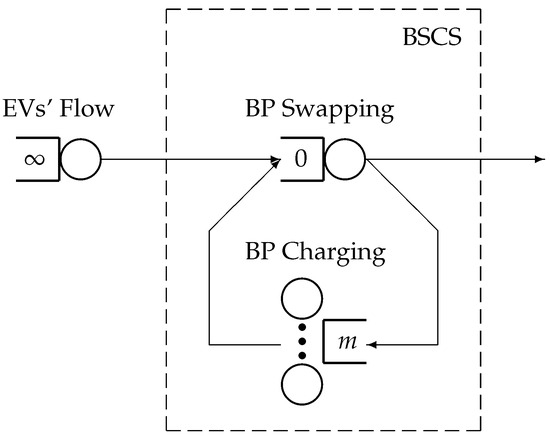 A graphical representation of a BSCS as a queueing model is given in Figure 1. The model consists of (i) a single-server queue, which represents an arrival source of EVs, (ii) a single-server fork–join queue, which represents the swapping of batteries, and (iii) a multi-server queue, which represents the charging of the batteries. All queues have infinite buffers. At the initial time, the first queue is assumed to have an infinite number of jobs (EVs), the second queue has no job (the EV and BP ready for swapping), and the third queue has m jobs (BPs ready for charging).