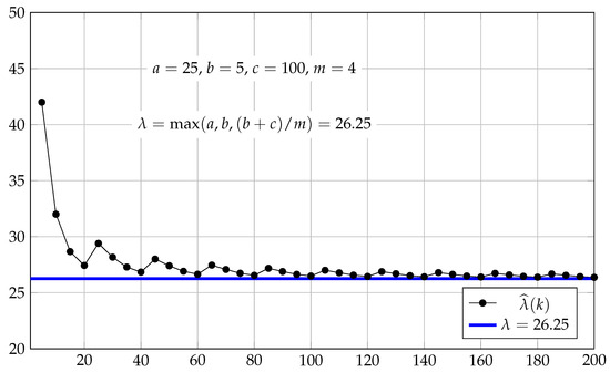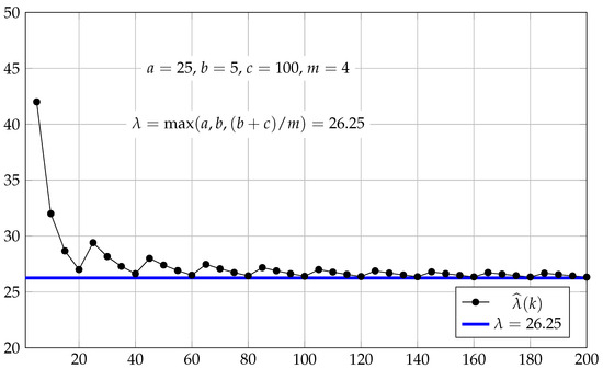 The simulation model consists of the recurrence relations in (1), which formally describe the evolution of the system. The simulation experiment involves the calculation of the state variables and for , where K is sufficiently large. The calculation of includes sampling from a given probability distribution to fix an interarrival time for each k. The estimates of the mean cycle time are evaluated for successive k to observe the convergence of the estimates to the value of specified by (12).