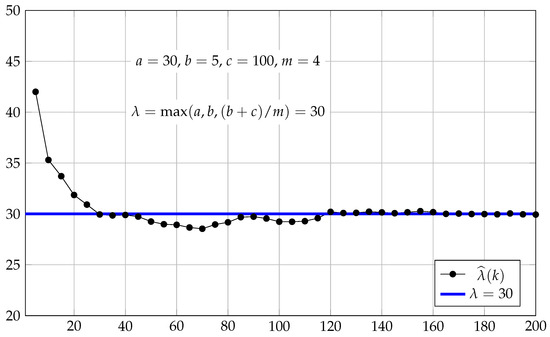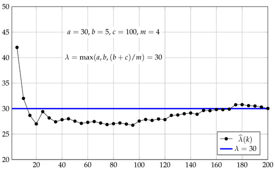 Figure 2 and Figure 3 show the results of evaluating the estimators for k from 1 to 200 step 5 by the simulation of the system with the exponential interarrival time with mean and , respectively. The simulation results for the same BSCS with the interarrival time uniformly distributed over (with mean ) and (with mean ) are given in Figure 4 and Figure 5.