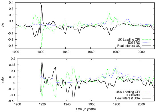 Time series for the three-month treasury bills for the UK (top) and US (bottom). The inflation index is shown in green (long dashes), the nominal interest rate in blue (short dashes), and the real interest rate is shown as a black solid line. Real interest rates display large fluctuations and negative rates are not uncommon.