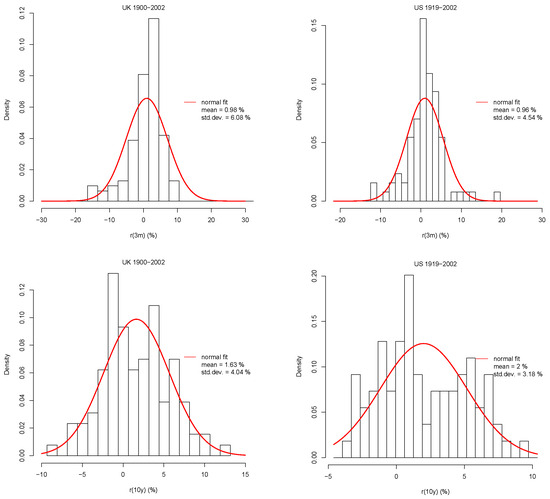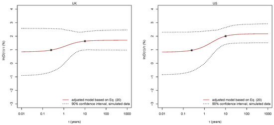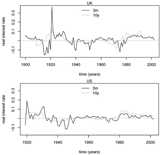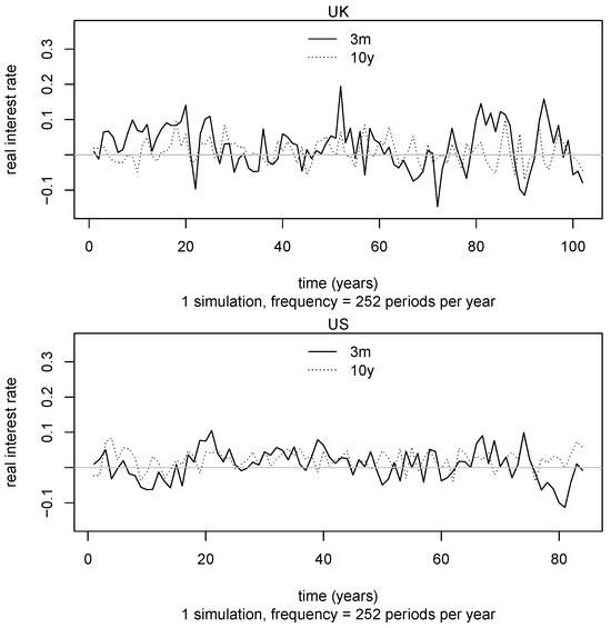 Real 3-month interest rates for the UK are negative 32% of the time, and there are four distinct periods where they drop to nearly reach % and even below. The 10-year real interest rates for the UK are negative 38% of the time. For the US, the real 3-month interest rates are also negative 32% of the time, dropping below % during World War II, and the 10-year real interest rates are negative 30% of the time. Given that the real interest rates are negative about a third of the time, this makes it clear that models such as the log-normal process or the CIR model [39,40] that assume rates to be non-negative are far from being appropriate. We therefore confine our empirical work to the Ornstein–Uhlenbeck model.