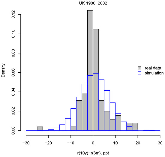 Histogram comparing yield curve inversions in the simulated vs. real data for the UK. We measure yield curve inversion based on the difference between the 10-year interest rate and the 3-month interest rate; positive values indicate a normal yield curve and negative values an inverted yield curve. Interest rates are measured in percent. The real data are shown in grey, the simulation in white. The real data are heavier-tailed, but the agreement is otherwise reasonably good.