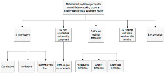The manuscript comprises four primary portions, as illustrated in Figure 1. Section 1 provides an overview of the introduction to the NDN, encompassing its contribution and motivation, the methodology employed for selecting articles, and an outline of the manuscript. Meanwhile, Section 2 provides an exposition of the operational principles and methodologies of NDN mobility. This manuscript examines the underlying architecture and a comprehensive overview of consumer and producer mobility strategies. The following section explores critical contemporary NDN technologies, such as anchorless, dual-routing planes, locator-based, proactive handover, and rendezvous. Consequently, Section 4 explores the unresolved matters and difficulties of NDN mobility. Section 5 provides a conclusion and offers recommendations for future research.