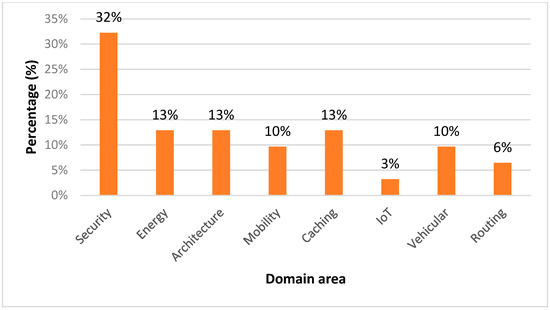 In the year 2022 there was a variety of review research from different perspectives, especially regarding vehicular NDN [43,44], security and privacy over NDN [45,46], mobility on NDN [47], as well as forwarding and routing on NDN [48]. There were significant discussions on routing, caching, and security mechanisms. Note that the latest review in 2023 was on new discussions on NDN architecture [49], application of NDN [50], technology updates over NDN [51], security and privacy concerns about NDN [52], and caching with NDN [53]. Figure 2 illustrates the percentage of review papers based on the selective domain of NDN.