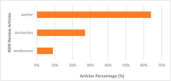 Figure 3 depicts the percentage of the NDN review articles. Based on the figure, the anchor technique is the most popular topic for discussion in a journal, reaching almost 62%, while the anchorless technique is at 29%. Fewer papers are published on the rendezvous technique, covering 9%. Therefore, the solution is to study more rendezvous techniques to determine the limitations and gaps.