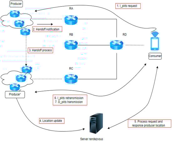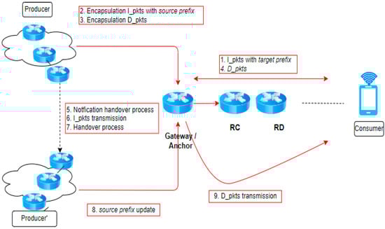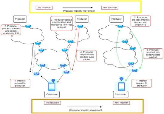 Moreover, it offers improved security functionalities, including cryptographic signatures and a naming structure, simplifying access control and data privacy implementation. NDN mobility, like its simple counterpart, encompasses consumer and producer mobility. Figure 4 illustrates the operational procedure of consumer mobility and the support provided for producer mobility.