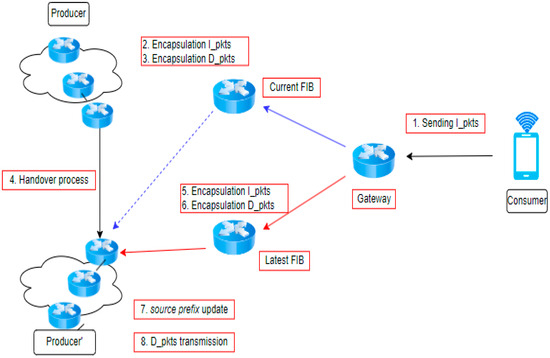 Producer mobility employs mapping-based methodologies within the NDN technology to deliver user-requested content based on location attributes [66]. This method is also employed in IP mobility technology to ascertain packet transport and consumer location. DNS servers and NDN broadcasts must detect name content based on the CN utilized. Interest packets are distributed to all user interfaces for NDN broadcast scenarios. If the broadcast function is inaccessible within the NDN network, the producer mobility will execute the latest location update and inform the closest DNS server. NDN possesses a broadcasting feature and can interface with wireless network technology. In the above case, when several users request identical data, a singular interest packet is distributed to all of them.