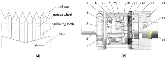 (a) The principle behind an end-face harmonic gear drive of oscillating teeth. (b) End-face gear of oscillating-teeth reducer structure. 1—output pedestal; 2—output shaft; 3—bearing; 4—circular spline; 5—oscillating teeth; 6—grooved pulley; 7—shell; 8—spring; 9—spring collar; 10—Universal ball bearing bushings; 11—Universal ball bearing; 12—cam; 13—shaft end ring; 14—input pedestal; 15—input shaft; and 16—shaft coupling.