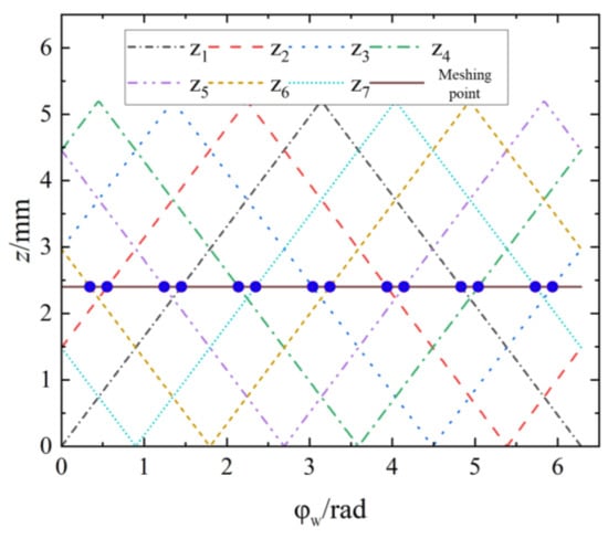 The horizontal line in the figure represents the displacement required for the oscillating teeth to enter the meshing state. When the displacement of the oscillating teeth is higher than the horizontal line, the oscillating teeth enter the meshing. In the contrary situation, oscillating teeth are disengaged. That is, the number of meshing teeth at the intersection of the horizontal line and the fold line changes.