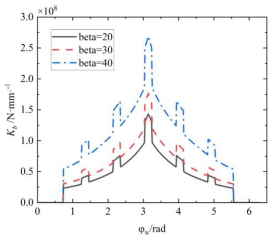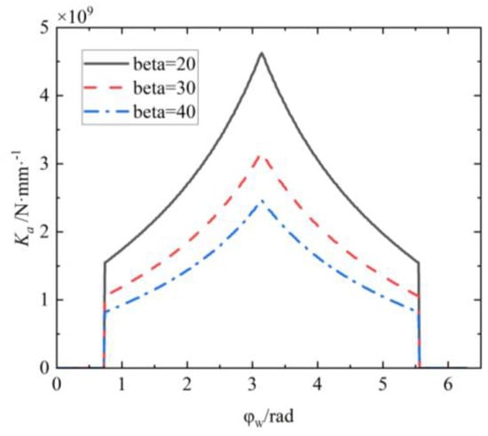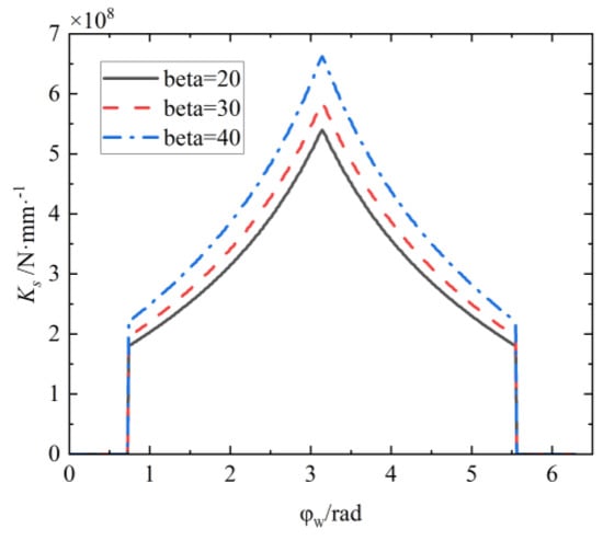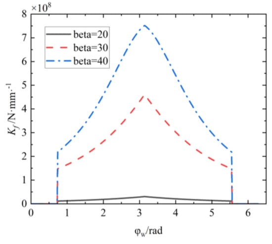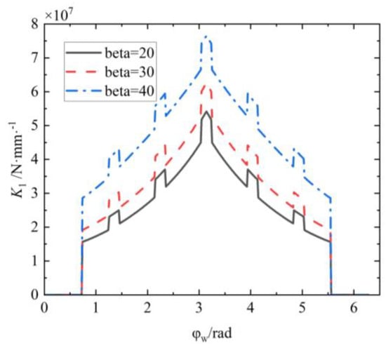 Setting as the cam rotation angle, through the self-compiled software (Mathematica 12.1) for example analysis and drawing curves, the stiffness of each part of the first oscillating tooth can be obtained as shown in Figure 5, Figure 6, Figure 7, Figure 8 and Figure 9.