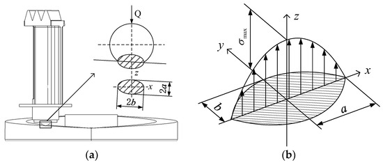 A universal ball bearing is used between the oscillating teeth and the cam, and its contact point expands into a contact surface under the action of load N. The contact surface is projected onto the vertical surface of the contact normal, as shown in Figure 11a. In the contact area between the universal ball and the circular spline, the contact stress is distributed in the semi-ellipsoid, as shown in Figure 11b.