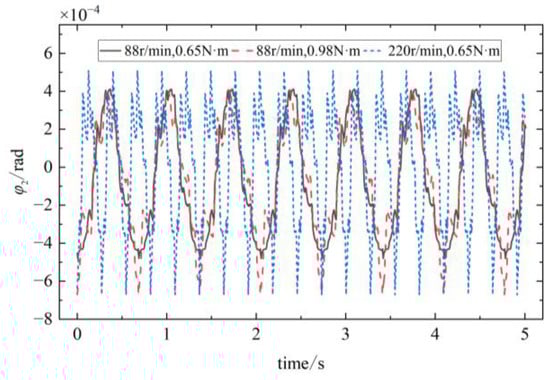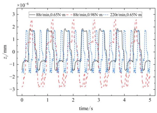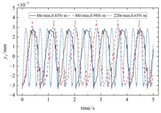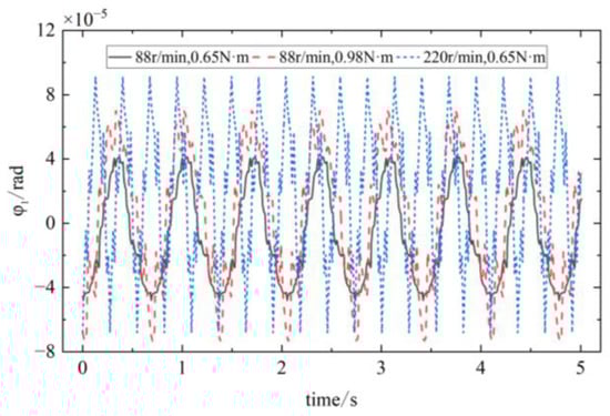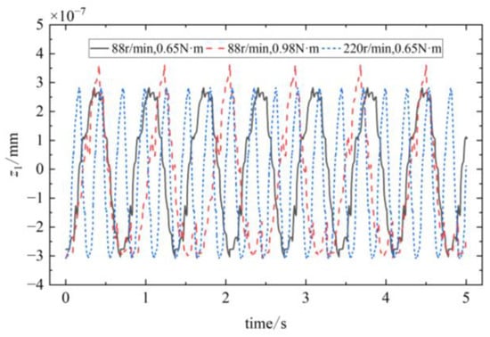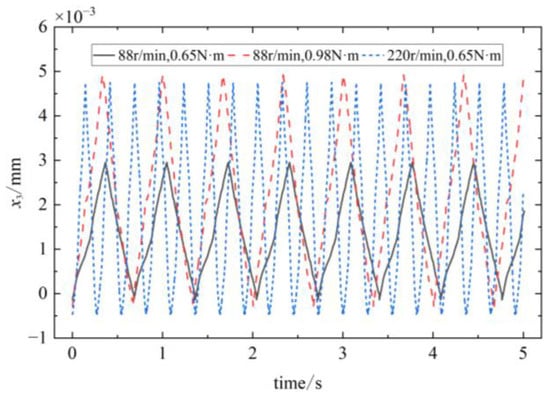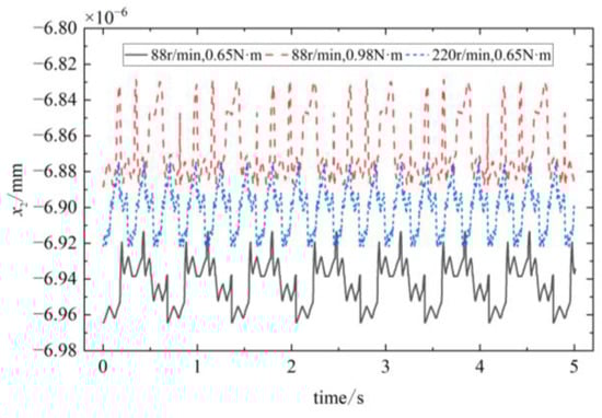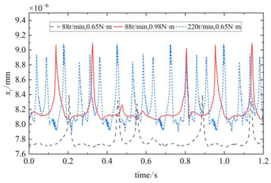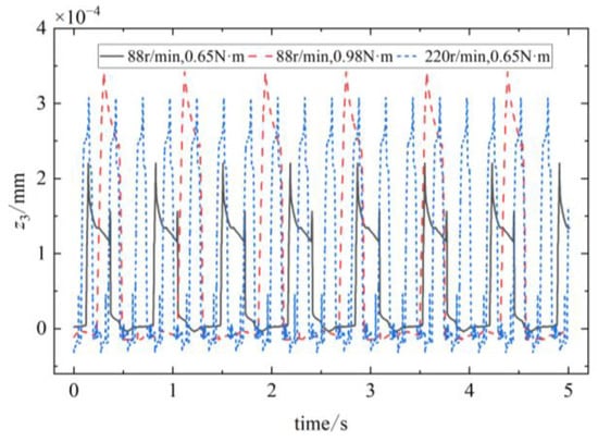 The nonlinear dynamics differential equations can be solved using the Runger–Kutta method. Setting speed and load of the cam in three different states and setting damping as Rayleigh damping, the transient vibration displacement response of the cam along each independent coordinate is obtained as shown in Figure 14, Figure 15, Figure 16 and Figure 17, respectively.
