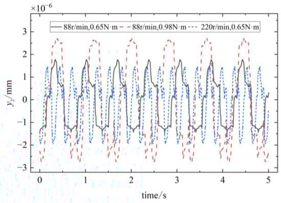 In Figure 22, Figure 23 and Figure 24, the results show that the transverse displacement of the oscillating teeth is the largest. The reason for this is that the setting of the angle between the oscillating teeth and the teeth of the rigid circular spline results in the line of action of the load being more directed in the transverse direction of the oscillating teeth. Therefore, the oscillating gear teeth are subjected to greater deformation and vibration responses along the transverse direction on entering meshing.
