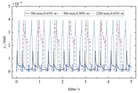 In Figure 14, Figure 15, Figure 16 and Figure 17, the results show that the cam’s transverse-displacement response is slightly larger than the radial displacement response. The reasons for this are that the cam-profile-surface lift angle and return angle are along the transverse direction, there is a fixed angle of contact between the cam and the oscillating teeth, and most of the vibration is transmitted to the transverse direction of the cam.