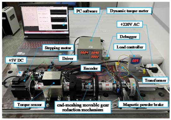To validate the results of the nonlinear dynamics study of the end-face harmonic transmission system, we built the test bench shown in Figure 25. 220V AC power is stepped down by a transformer to supply power to the stepper motor, torque sensor, and magnetic particle brake. The inputs control the stepper motors for power input through the driver, and the development board used is powered by 5V DC. The torque sensor is mounted on the input side of the end-meshing harmonic reducer to measure speed and torque, which are then read by the dynamic torsion-triple-display meter. The encoder is mounted to the output side to measure the real-time rotational speed of the output shaft, and the signal conversion is accomplished by the debugger. Magnetic particle brakes are mounted to the end to provide load and are adjusted in size by the load controller. The resulting sensing signals are transmitted to the PC for data processing.