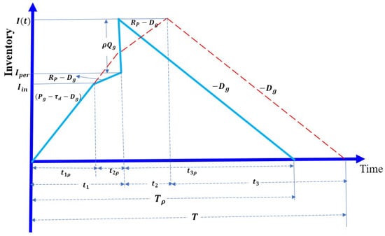 Owing to imperfections in the production process, the manufacturer outsources a  portion of the total ordered quantity to avoid a shortage situation. It is considered that all outsourced items are of perfect quality. Therefore,  indicates all items are outsourced, and  indicates no item is outsourced, that is, all items are produced by the manufacturer. In Figure 1, the dotted line indicates that , i.e., no item is outsourced. If the  portion of the total quantity is outsourced, then the total inventory is given by . These items deplete at a demand rate  within time , i.e., = . As per Figure 1,  is the pure production time, which can be obtained as .  is the portion of repairable imperfect items, and the reworking time  can be calculated as . Therefore, production downtime  can be formulated as .