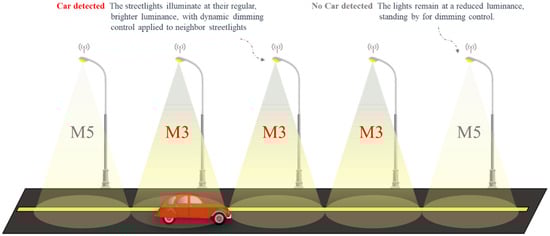 Figure 1 shows the operation of a streetlight dimming control system based on vehicle approach. As the vehicle is detected, a few streetlights illuminate brightly (M3), while the rest remain dimmer (M5). However, there are a lack of international and domestic standards for smart LED streetlights to maintain the average luminance of roads when dimming is controlled. In the case of the Republic of Korea, there are certification standards for streetlights under the KS C 7658 clause, but these are limited to the contents concerning lighting and components. Additionally, there are certification standards for high-efficiency energy equipment, but these are confined to the safety standards of indoor smart LED lighting. Some research has been conducted on test standards for indoor smart LEDs and dimming control according to traffic volume [