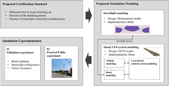 Figure 2): (1) simulation modeling, (2) derivation of certification standards, and (3) simulation-based experimental analysis. First, the simulation model describes the environment in which the smart LED streetlight dimming control system is deployed and operated in a real-world environment. Because luminance analysis is important in streetlight analysis, we have separated it into streetlight modeling to describe it in detail. We then modeled the installation conditions of streetlights according to the Korean Road Safety Facility Installation and Management Guidelines and constructed a simulation analysis environment using Relux, a simulation analysis tool used specifically for lighting analysis [