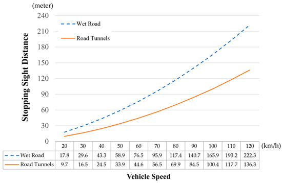 Figure 4 shows the required stopping sight distance depending on vehicle speed on a wet road surface and in a tunnel environment. The graph indicates that the required stopping sight distance increases as the vehicle speed increases and that wet road surfaces require a larger stopping sight distance than a tunnel environment [