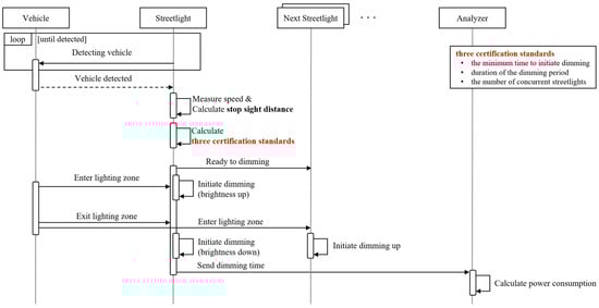 Developing certification standards for streetlights is time-consuming and costly because of the need to install streetlights and to conduct tests manually. Owing to these practical constraints, there are several studies in various fields that provide certification standards and analysis results through simulation [7,8,9,10]. Using simulation methods, specific certification standards can be obtained through scenarios that consider diverse installation situations and conditions. In this study, we first identified new certification standards focusing on the dimming control of the LED streetlight system, which substantiates the significance of the efficiency of operation achieved by the system.