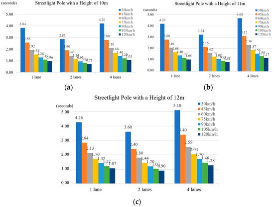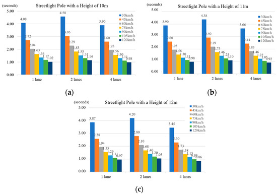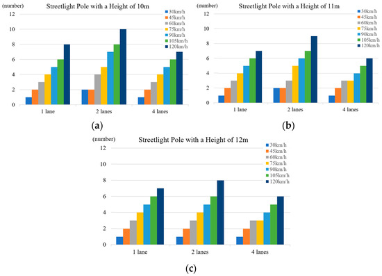 We conducted two primary experiments using the proposed model. In the first experiment, three certification standards were derived from 630 scenarios, considering the road environment and installation conditions of streetlights. We obtained the “Minimum time to begin dimming-up”, which is the time required to increase the brightness through dimming control after recognizing a vehicle; “Duration of the dimming period”, which is the time required to maintain the brightness until the vehicle passes; and “Number of streetlights controlled simultaneously” that are required to ensure a safe sight stopping distance according to the vehicle speed. In the second experiment, the proposed certification standards were verified using real cases on two roads in Anseong City, Republic of Korea. In this study, certification standards for satisfying the streetlight standards for various streetlight installation conditions and vehicle speeds in a smart LED streetlight system were obtained through the simulation method. This is expected to improve road safety by improving visibility for the driver.