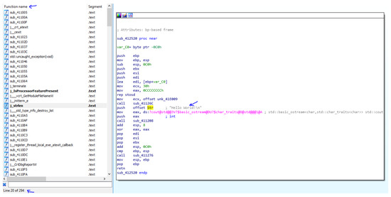 For instance, as it is shown on Figure 1, one well known compiled the “Hello, world!” program (see Figure 2) contains: library functions–294; function main()–1. Of course, this is an artificial example. However, this particular case shows that the main function contains an average of 50% of open source libraries. Therefore, the researcher is forced to spend lot of time analyzing the library functions. During such a study, meaningful comments and names in the function can provide a faster understanding of the purpose.