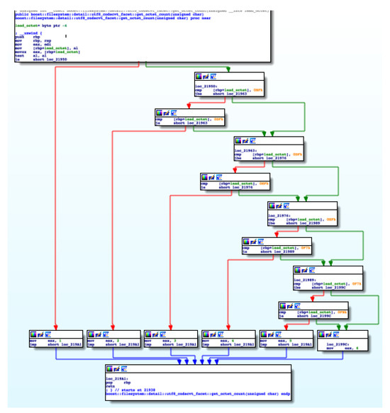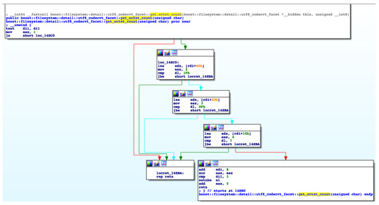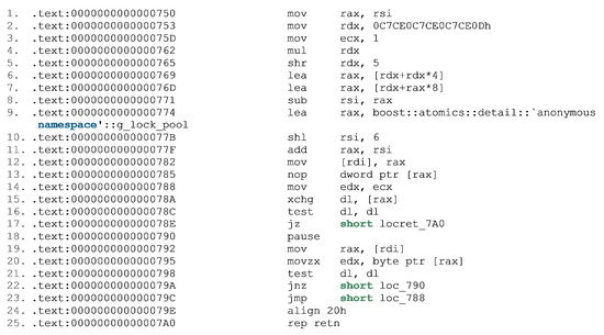 The second compilation was an optimized one. As it is well-known, optimized compilation tries to minimize or maximize some attributes of an executable computer program. This compilation requires flag “-02” as input to “make” program through boost script. The optimization process drops all “redundant” information from the executable. The optimized Assembly implementation function may be much smaller and different than in the debug mode, compare Figure 6, Figure 7 and Figure 8.