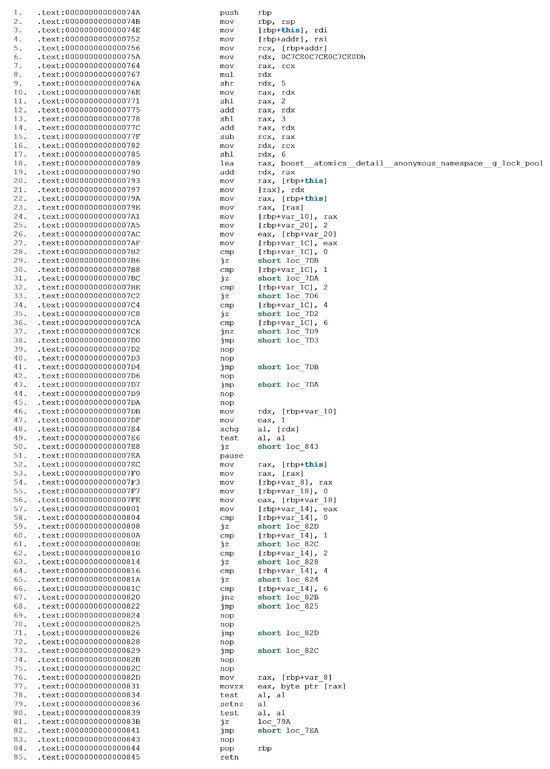 Now, we take a real example from boost libraries. We compare between two different results of compilation of the “scoped_lock” function, compiled with the debug flag, as shown on Figure 9. The optimized result is rather shown on Figure 10 “scoped_lock(void const volatile*)” function. Now, we propose some features for comparison of two functions: one with debug and the optimized one.