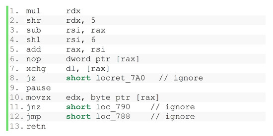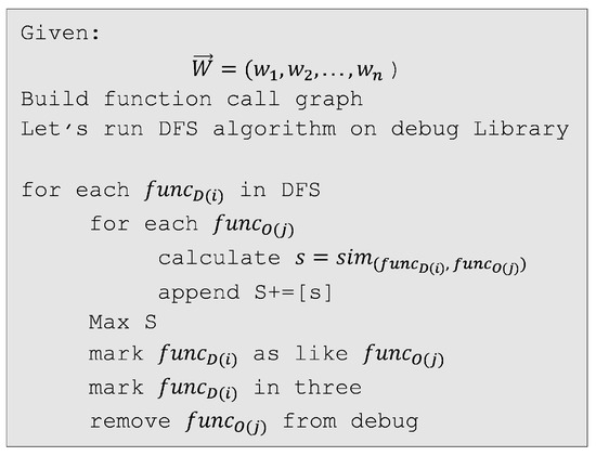 The authors of [31,34], on the one hand, handle loops. However, they use very expensive from the computational point of view libraries, which is again not acceptable for us. Sharma et al., cf. [23] introduce machinery for detecting equivalence between high-level code and binary even with loops. The machinery is based on a simulation relation between the high-level code and the binary. However, again, the implementation is very complicated from the computational point of view and it is not easily scalable.