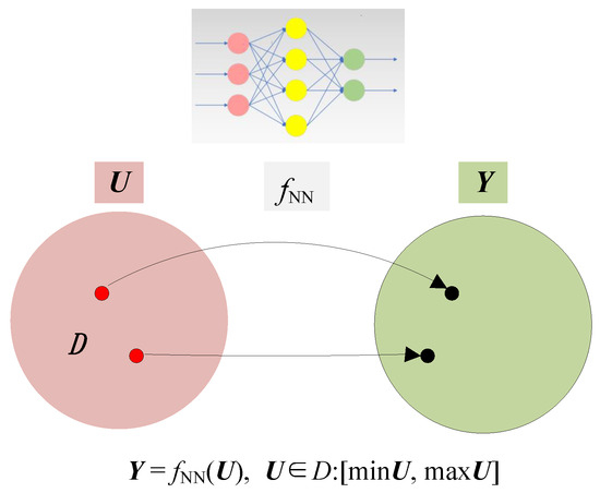Under stationary conditions, conventional neural networks use datasets to establish a nonlinear mapping relationship from input to output. The default condition is that values of the prediction data vary within the boundaries of its modeling training input data, which can be given as follows in Equation (5):