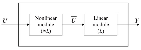 U, and , Y in Figure 6 are system inputs, intermediate variables, and outputs, respectively. and L represent nonlinear modules and linear modules, respectively. The Multi-Input Multi-Output (MIMO) Hammerstein system is more complex and able to describe a variety of nonlinear systems with relative accuracy, such as system models for hydraulic excavators, solid oxide fuel cells, and magnetorheological dampers. By introducing a static nonlinear function at the input stage of the state–space model, we can construct a MIMO Hammerstein model with Gaussian noise. This stochastic system can be formulated as follows: