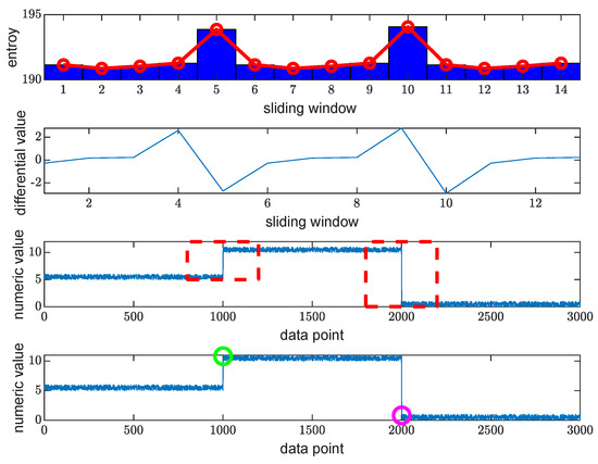 where represents the change in entropy between adjacent windows. From the definition of information entropy. It can be seen that the first-order difference value of the information entropy of the sliding window containing the jump points is significantly higher than the first-order difference value of the information entropy of the sliding window without the jump points. By comparing the results of the first-order difference in entropy, the sliding window containing the jump points can be detected. Denote the window which contains the jump point as follows: