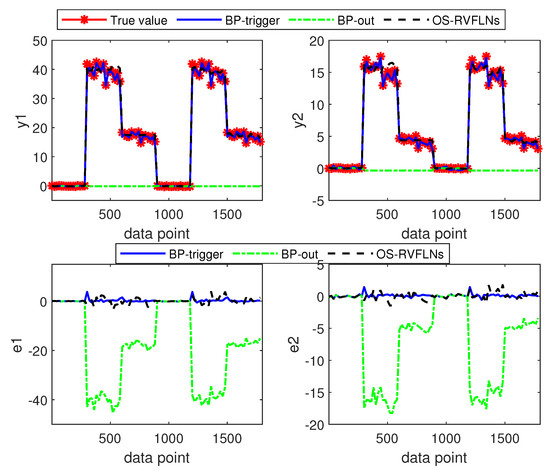 Following the procedure introduced above, 300 sets of data are taken from data sets I–V I to form an 1800 groups test dataset. We use the BP neural network for the triggered relearning modeling method to predict the input and output datasets containing the jump dataset. In order to show the superiority of the proposed method, the conventional BP neural network and the online sequential random weight neural network (OS-RVFLNs) modeling method also applied to the same system to compare. To ensure the validity of the comparative experiment, the training data and test data are exactly the same, and are all datasets containing the jump dataset. The modeling prediction results are shown in Figure 10.