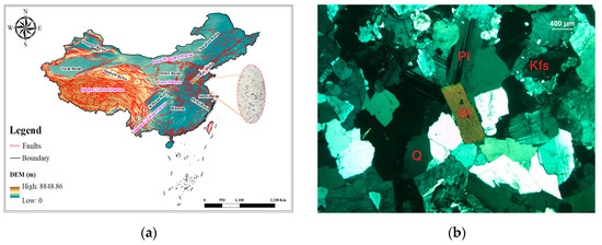 The granite samples for this study were collected from the Jining area of North China, as shown in Figure 1a. The rock exhibits a typical fine-grained granitic texture and massive structure. There is only minor kaolinization of potassium feldspar and weak biotitization of biotite. The composition mainly consists of potassium feldspar (40%), quartz (35%), plagioclase (20%), biotite (4%), with trace amounts of chlorite, apatite, zircon, and opaque minerals (1%), characterizing it as a typical fine-grained biotite granite, as depicted in Figure 1b.