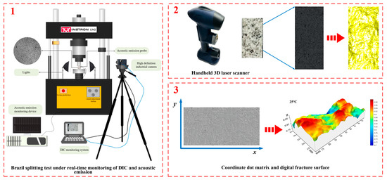 The post-thermal disturbance samples undergo a testing program comprising three parts, as depicted in Figure 2. In the first part, an AE testing apparatus and a digital image correlation (DIC) system are utilized to capture the acoustic emission events and the evolution of the planar strain field during the Brazilian test conducted on an INSTRON 1342 testing machine. The second part involves the digital 3D imaging of the fractured surfaces of the Brazilian split specimens, specifically through the reconstruction of the digital fracture surfaces using a handheld 3D laser scanning system, followed by point cloud processing. In the third part, high-precision point cloud data are used for the digital characterization of the fracture surface morphology, further employing digital image techniques and statistical methods to delineate the fracture surfaces.