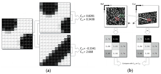 An example demonstrating the effectiveness of the two correlation criteria: (a) the grayscale value on the left is compared with two grayscale values on the right. The correlation criteria indicate that the grayscale value in the upper right matches the set of grayscale values on the left (CCC close to 1, CLS close to 0). (b) In the reference image, the green subset represents the initial reference subset, and the red subset marks the positions of the final subsets in both the reference and current configurations [44].