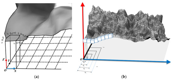 Initially, the captured point cloud data of the three-dimensional rough surface are rendered and filtered to remove noise points. Subsequently, a digital elevation model, as shown in Figure 4, is established on the XOY plane. Assume the existence of a square grid with a side length of δ in the XOY coordinate system. The four corner points of the grid, (i, j), (i, j + 1), (i + 1, j), and (i + 1, j + 1), correspond to four points on the surface with heights z1(i, j), z2(i, j + 1), z3(i + 1, j), and z4(i + 1, j + 1), respectively (where i ≥ 1, j ≤ n − 1, and n is the number of measurement points per side).