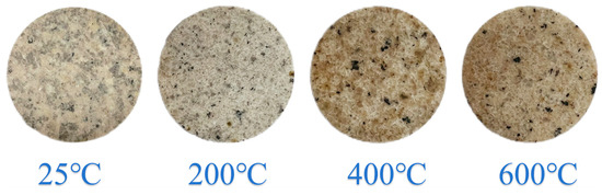 Figure 7 presents the state of granite after being heated to various target temperatures and subsequently cooled in a 15 °C environment. It is observed that with the increase in thermal disturbance temperature, the color of the rock samples shifts from light white-gray to light brown. The quantity of biotite in the samples decreases, but its color becomes particularly prominent. Additionally, it is noticeable that after 400 °C, the surface of the samples is densely covered with many intergranular cracks, and the crystals of feldspar and quartz become increasingly distinct.
