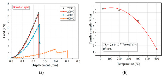 Results of the Brazilian test under different thermal disturbance levels: (a) displacement-load curve and (b) tensile strength.