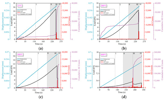 Load and acoustic emission history during the Brazilian test process of granite under different levels of thermal disturbance: (a) 25 °C, (b) 200 °C, (c) 400 °C and (d) 600 °C. The boundary lines drawn in these figures are based on an integrated consideration of the load–displacement, load–time and AE characteristics, but this demarcation is qualitative rather than quantitative.