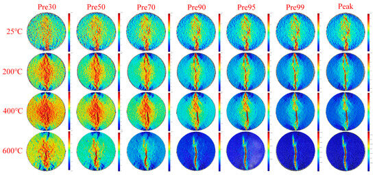 - With increasing temperature, the load level at which cracking initiates in the center of the Brazilian samples is lower, and the areas of high strain are more concentrated. Consequently, there is a greater rate of horizontal displacement expansion in the center of the specimens, especially at 600 °C.