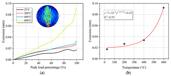 To investigate the displacement changes in the specimen in the X direction during the loading process, two horizontal points, A and B, along the X direction and passing through the center of the circle, were marked using DIC, as shown in Figure 12a. By calculating the distance between these two horizontal points, the displacement change in the X direction (lateral displacement) of the specimen during loading can be determined. It is not difficult to observe that as the lateral displacement approaches the peak load, the displacement increases. Specifically, when the load reaches 80% of its peak value, a significant leap in lateral displacement can be observed at almost all thermal disturbance temperature levels. This leap is most pronounced after reaching 95% of the peak load. Figure 12b presents the displacement change information under different thermal disturbance levels. It is evident that the displacement exhibits a positive response to thermal disturbance temperatures, with the relationship displaying a non-linear positive correlation. At a temperature of 200 °C, the displacement expansion growth rate increased by 55.93% compared to 25 °C. At 400 °C, this growth rate continued to rise relative to 200 °C, reaching an increase of 94.77% compared to 25 °C. When the thermal disturbance temperature reached 600 °C, the displacement expansion growth rate experienced a dramatic increase, with a rise of 435.47% compared to 25 °C.