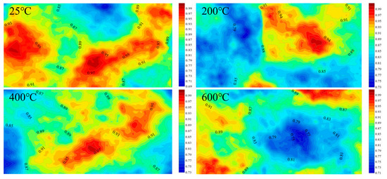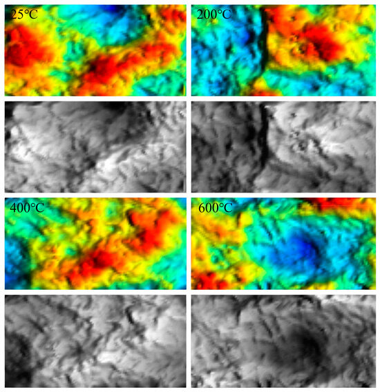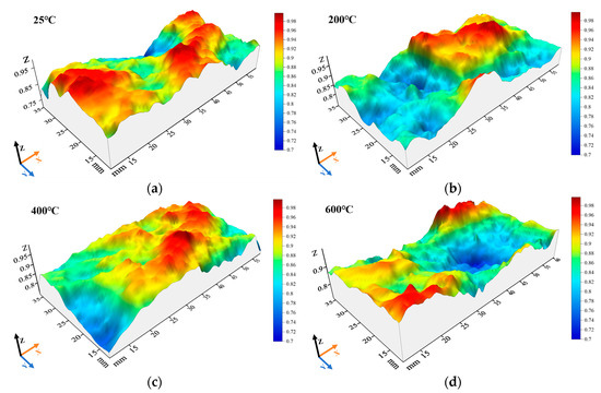The three-dimensional digital fracture surfaces of granite after Brazilian test at different thermal disturbance temperature levels are provided in Figure 13. It can be observed that the morphological characteristics of the three-dimensional digital fracture surfaces exhibit visually distinct differences influenced by temperature, which manifest as variations in elevation on the horizontal plane. Typically, it can be observed that as the temperature increases, the area with elevations greater than 0.9 experiences compression, and the undulating morphology undergoes changes.