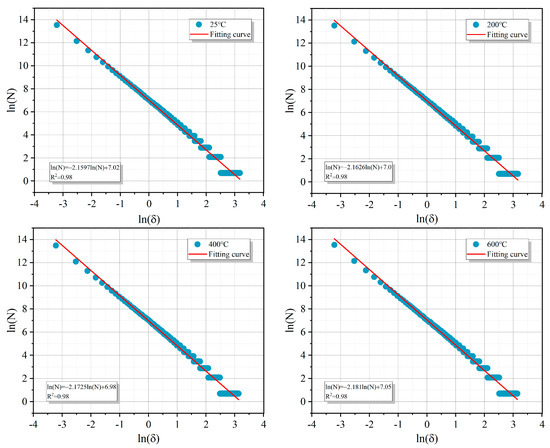 To further characterize and analyze this variation, the digital fracture surfaces of granite after Brazilian test, treated at different thermal disturbance temperature levels, were covered and counted using the box-counting method as described above, yielding lnN and lnδ fitting results, as shown in Figure 14. It can be observed that the R2 for all fracture surfaces are 0.98, indicating the reliability of the fitting results. The distribution patterns of the fitting curves and data points exhibit significant similarities at a macroscopic level. Additionally, the influence of thermal disturbance temperature on the fractal dimension of the specimen’s fracture surfaces is relatively small, with the main magnitude concentrated in the range of 0.001–0.01. To some extent, this similarity in accuracy with the fractal dimensions of mode-Ι fractures in thermally treated granite and dynamic fissured sandstone subjected to low-cycle impact as observed by Yin et al. [35] and Chen et al. [64].