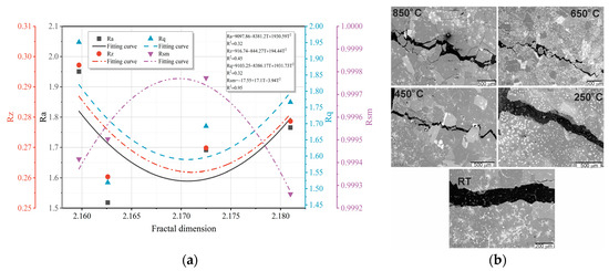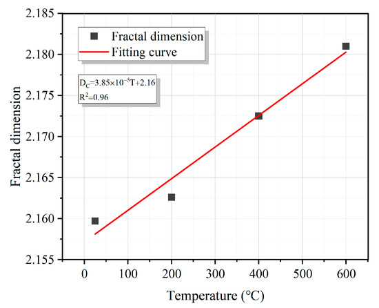 Therefore, the fractal dimension was analyzed with an accuracy of 0.001, and the corresponding fractal dimensions obtained from calculations were plotted in Figure 15. It is evident that within this precision range, the influence of thermal disturbance temperature on the Brazilian splitting surface of granite becomes more pronounced. Overall, as the heat treatment temperature increases, the fractal dimension also relatively increases. Specifically, the impact of thermal disturbance temperature on the sample’s fractal dimension exhibits consistency, but the degree of influence varies. For example, the fractal dimension of the sample surface at 200 °C increased by 0.13% relative to 25 °C, while at 400 °C, the fractal dimension of the sample surface increased significantly compared to 200 °C, with a relative increase of 0.59% relative to 25 °C. It is worth noting that when the thermal disturbance temperature reaches 600 °C, the fractal dimension of the sample surface relative to 25 °C only reaches a 0.99% increase, but this is already the peak. Furthermore, there is a significant linear positive correlation between the fractal dimension and the thermal disturbance temperature, as evidenced by an R2 value of 0.96.