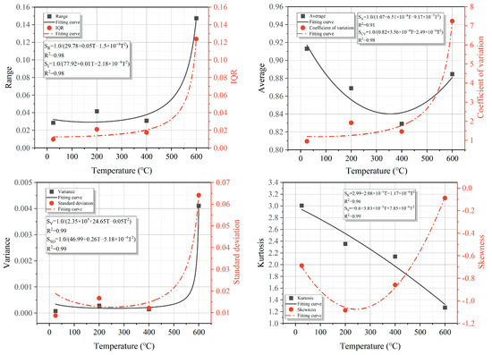 The differential impact of thermal disturbance on the Brazilian fracture surface of granite is primarily manifested through its influence on the distribution of elevation values. As depicted in Figure 21, there exist significant non-linear correlations between thermal disturbance temperatures and these statistical parameters, with R2 values ranging between 0.91 and 0.99. The fitting results for each parameter with respect to thermal disturbance temperatures are also presented in the figure. Concerning range and IQR, the impact of thermal disturbance temperatures shows high similarity, with low-level fluctuations between 25 °C and 400 °C, but a sudden, marked increase at 600 °C. A similar response pattern is observed in the coefficient of variation, variance, and standard deviation, suggesting the likely existence of a critical temperature point between 400 °C and 600 °C, at which a dramatic change in elevation characteristics occurs. Regarding the Average, this value is in a declining state between 25 °C and 400 °C, with an upward shift occurring at 600 °C. This transition point for Skewness begins at 200 °C. Kurtosis is the only parameter exhibiting a monotonic non-linear negative correlation with thermal disturbance temperature, indicating that thermal disturbance significantly degrades both the tail and the high peak of the elevation data of the granite Brazilian fracture surface.